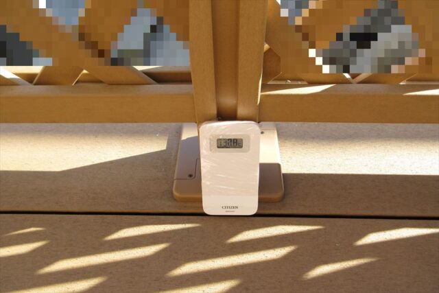 子機センサーの取り付け場所は、地面から1.5m~の高さが望ましいとのことで、洗濯干し台の支柱がいい高さにあったので、そこに1台めを設置することにした。