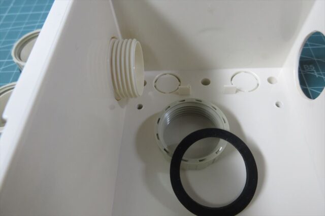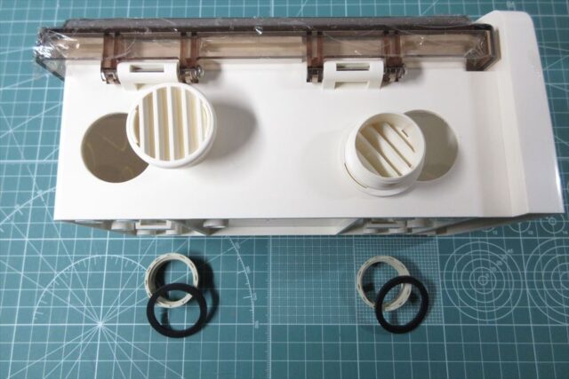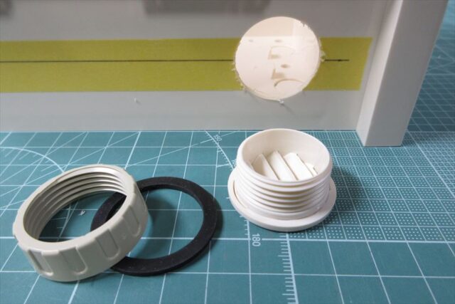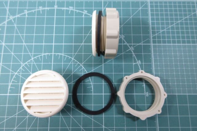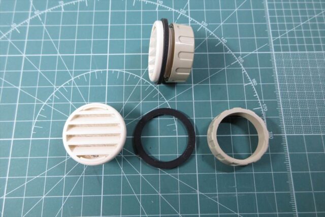 ルーバー、パッキン、ロックナットの3点パーツ。