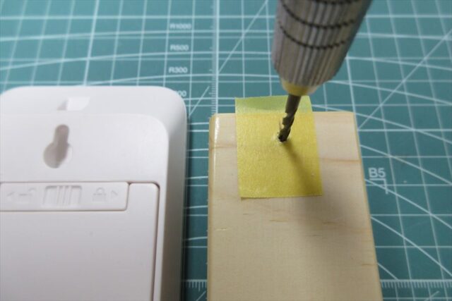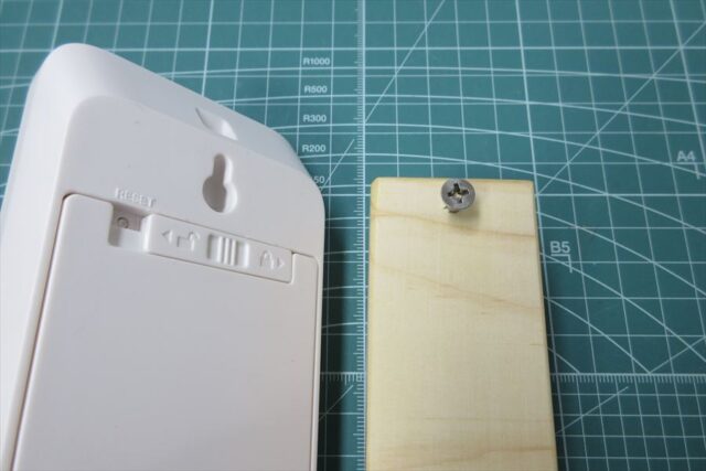 単純だが、木台に木ネジを打って子機背面の引っ掛け穴でぶら下げる方法にした。