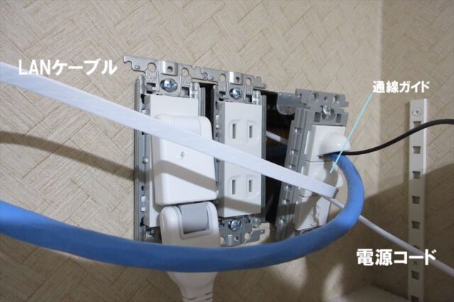 ④コンセントプレートの空きスペース(通線ガイド)を利用して壁内に通線。
