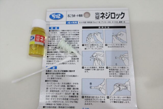 プラ製の石膏ボード用アンカーや、ボードに開けた孔を固めて補強できる薬液が入っている。