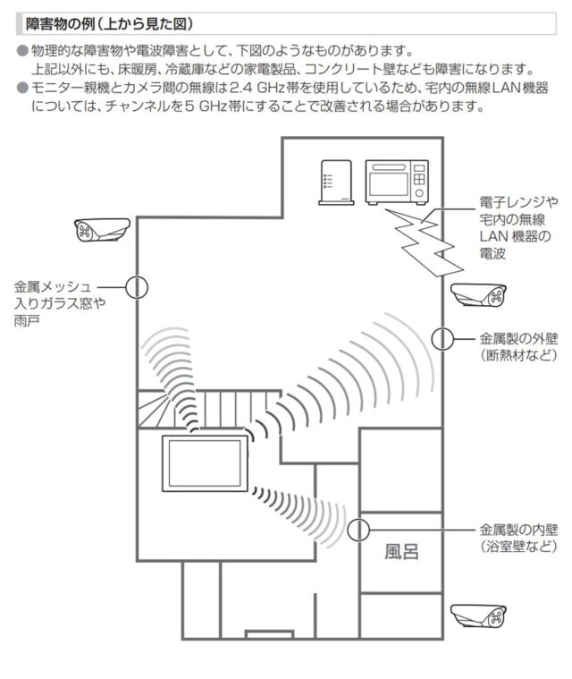 Wi-Fi(2.4GHz)でカメラと接続するため、設置場所や距離で電波状況が変わる。