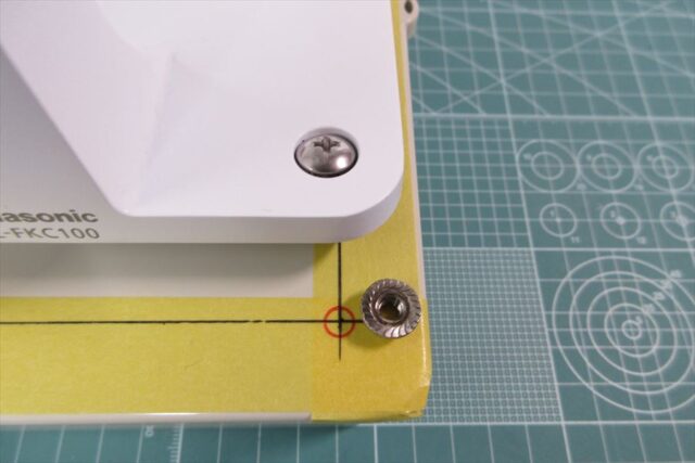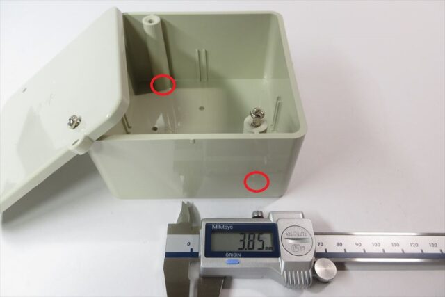 ちなみ加工孔とは別にあいている2つの穴は上蓋を止めるビス受け支柱(赤丸)なので、今回の設置ベース加工には無関係。