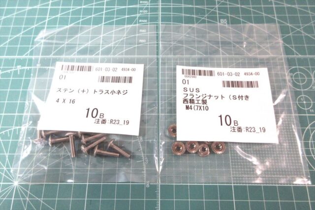 ビスは丸頭のM4×16mm、ナットは溝付フランジのM4、ともにステンレス。