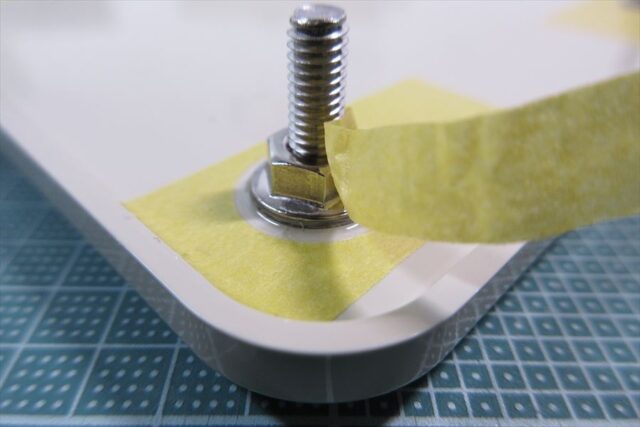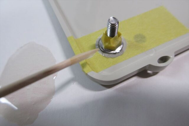 ネジ部分をマステ養生したら、ナットのフランジ外周にたっぷり接着剤。