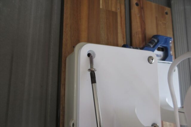 プルボックスと下地板の間には防水両面テープを貼付けてM4タッピングビス止め。