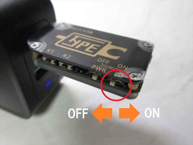 このUSBテスターはプロトコルトリガーを備えているが、通常充電のテストなの、このスイッチはOFFにしてテストする。