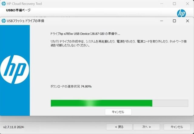 まずHPリカバリーツールからのリカバリドライブを作る。