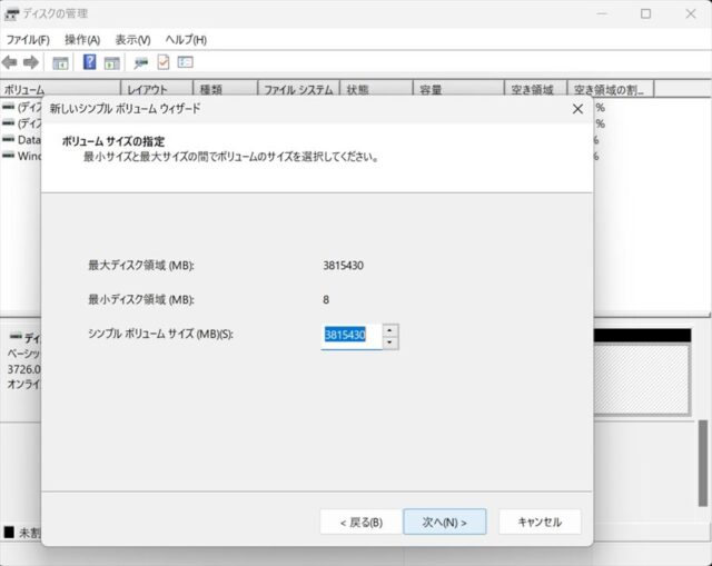 ボリュームサイズ選択画面になるが、全体を単一ドライブにしたいので最大のままで。