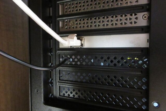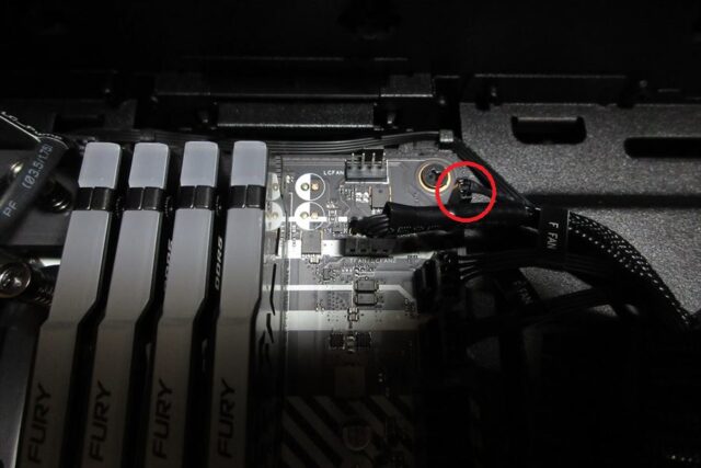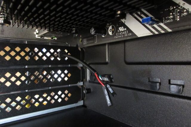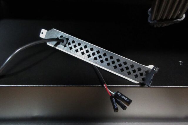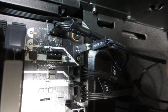 マザーボード内のpinコネクタから延びるケーブルは、PC背面のスロットカバーから外に出す。