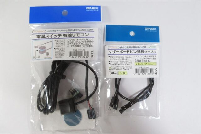 用意したのは“電源スイッチ有線リモコン”と“マザーボードピン延長ケーブル”。
