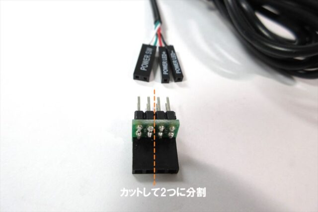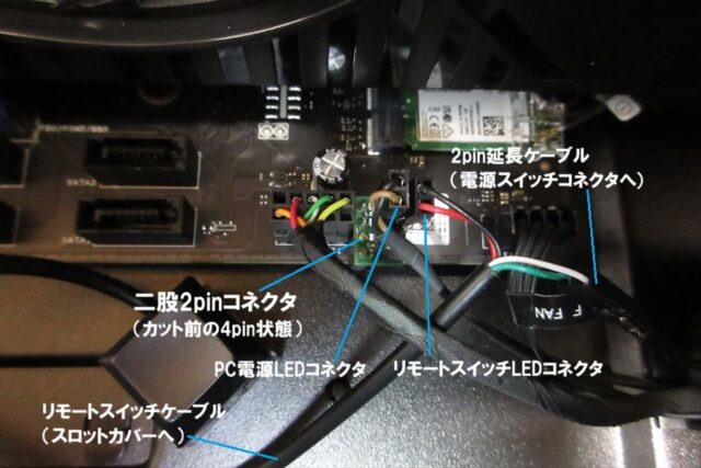 そこに二股2pinコネクタを挿し、PCの電源SWコネクタとリモートSW行き延長ケーブルを挿す。