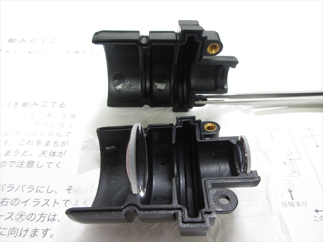 対物レンズとナットを入れた鏡筒(半割)にもう片側の鏡筒(半割)をかぶせる。
