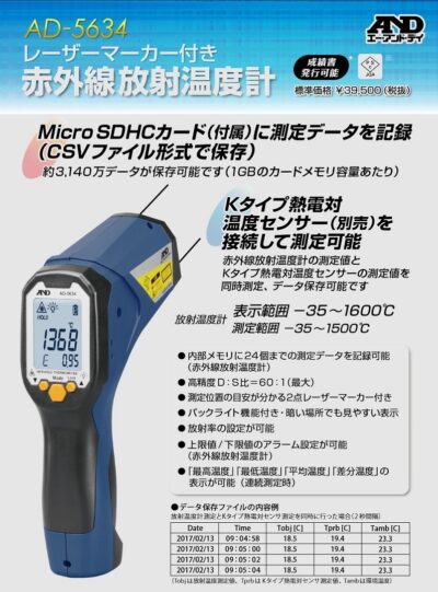 エーアンドデイ社の放射温度計(携帯グリップ型)には、AD-5614・5616・5618・5619・5635など幾つかのモデルがある。