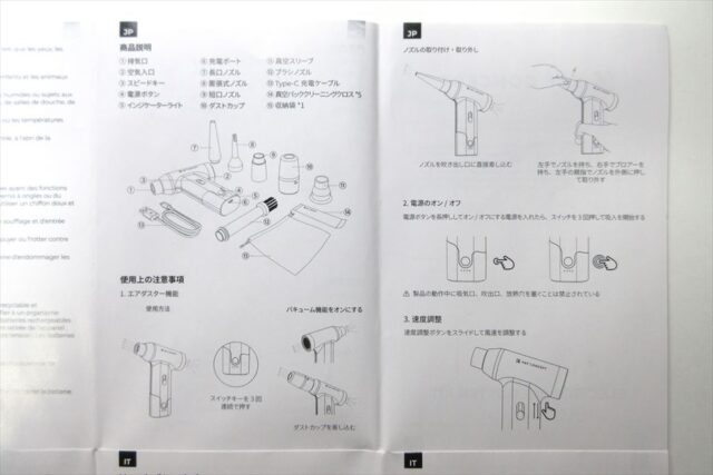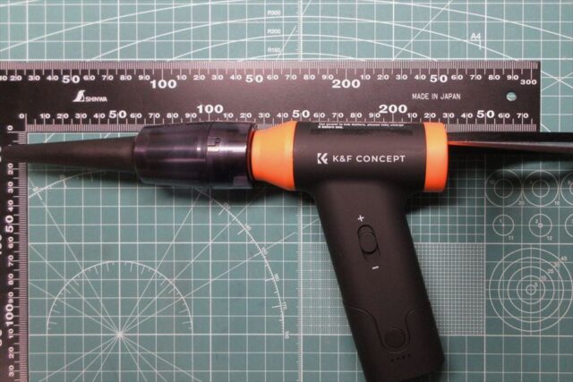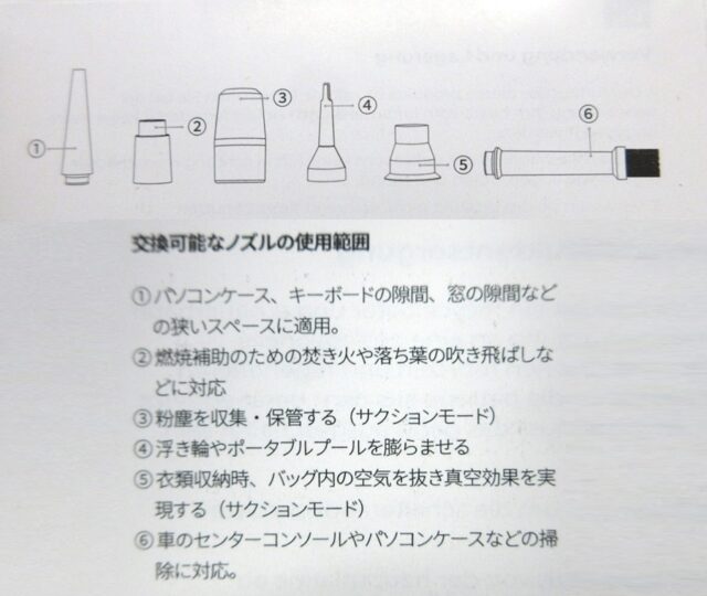 なので「エアブロワ」としての大きなパワーを期待しすぎてはいけないのかもしれないが、個人的に一番使う先細(長口)ノズルが13.4m/sしかなかったのは少々ガッカリ。