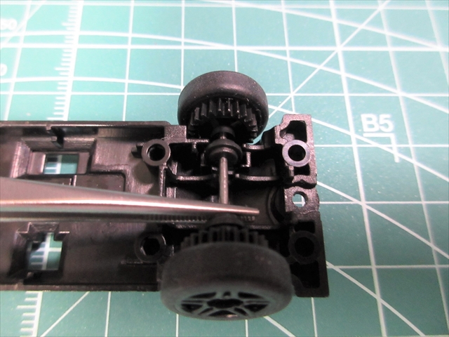 軸受けパーツの位置に注意してリアウィールを乗せる。